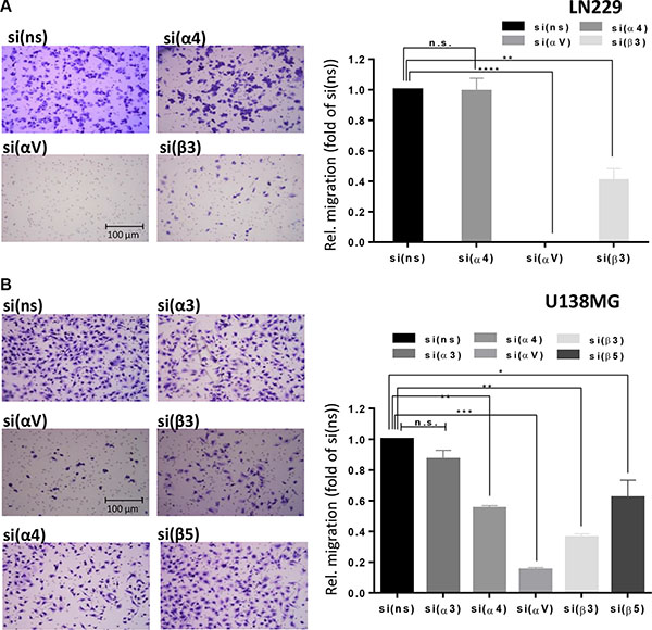 Figure 10: Integrin subunit knockdown decreases migration. Cell migration was determined in (A) LN229 cells upon transfection with control-, α4-, αv- or β3-siRNA and (B) U138MG cells upon transfection with control-, α3-, α4-, αv-, β5- or β3-siRNA. 48 h after transfection, the cells were starved for 24 h and cell migration was measured in Boyden chambers. After 22 h, cells on the underside of the membrane were stained with crystal violet, photographed and counted. Averages of five microscope fields ± SD are shown. *p ≤ 0.05 significant, **p ≤ 0.01 very significant, ***p ≤ 0.005 highly significant, ****p ≤ 0.001 most significant.