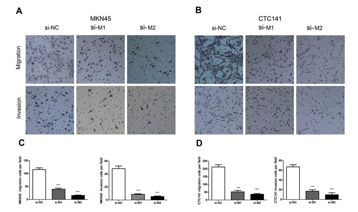 Figure 4: Effect of MALAT1 on cell migration and invasion. (A, C) MKN45 cells were transfected with MALAT1 siRNA or si-NC. Transwell assays were performed to investigate the migratory and invasive ability. (B), (D) The migratory and invasive ability of CTC141 were detected by transwell assays. Data represent the mean ± S.D. from three independent experiments. ** P <0.01.