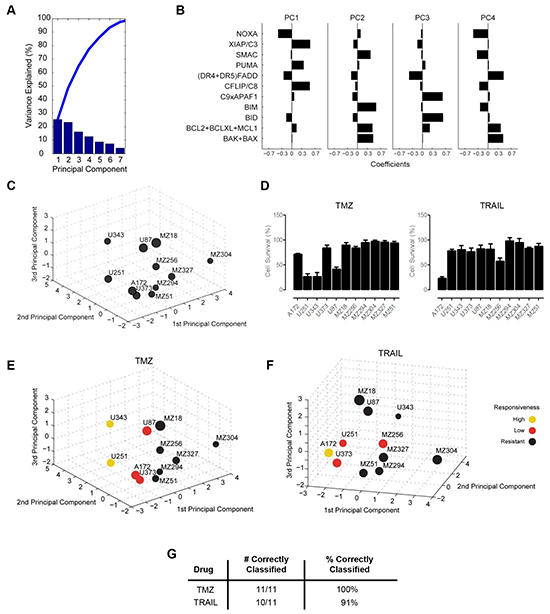Subsequently, cell lines were defined treatment-specifically as highly responsive (up to 30% survival), low responsive (30-80% survival) or resistant (>80% survival). According to the definition of response classes, the cell lines positioned in the PC space were color coded (Figure 2E, 2F). Interestingly, it appeared that within the 3D space, resistant cell lines seemed to be spatially separated from cell lines with higher responsiveness (Figure 2E, 2F). While visually this pattern was obvious, we tested whether this separation could likewise be achieved objectively by using linear discriminant analysis (LDA), an algorithm that aims to separate the responsiveness groups by hyperplanes in the 4D PC space. The separation of the response groups by this approach was highly accurate, with all cell lines correctly classified into their respective response groups for TMZ treatment responsiveness (Figure 2G). For TRAIL responsiveness, only one highly responsive cell line was identified, which was pooled with the next highest responsiveness group for all subsequent analyses. LDA correctly classified 10/11 cell lines (91%) for TRAIL responsiveness (Figure 2G). Taken together, these findings indicate that protein data of key cell death regulators together with information on their interplay can be employed to separate GBM cell lines according to their TMZ and TRAIL responsiveness.