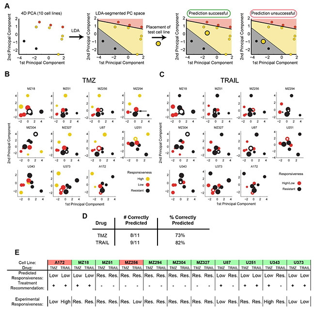 We next investigated whether the above findings can assist in predicting the responsiveness of individual cell lines to TMZ or TRAIL. We hypothesized that conducting the above analyses with a reduced number of cell lines may be sufficient to generate a PC space that can be segmented into spatial regions that reflect different levels of treatment responsiveness. We conducted a leave-one-out cross validation (LOOCV) in which we used the data from 10 cell lines and subsequently positioned the 11th cell line into the LDA segmented PC space. If the placed cell line (test cell line) was positioned within the correct response region, the prediction was considered to be correct (Figure 3A). A visualization of the results limited to the first two PCs for TMZ and TRAIL response predictions is shown in Figure 3B, 3C. The prediction accuracies are summarized in Figure 3D; this demonstrates that TMZ and TRAIL responsiveness can be predicted with high accuracy (73% and 82% correct predictions, respectively).