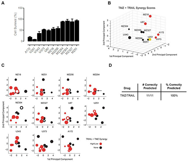Figure 4: Predicting the synergy of TRAIL and TMZ combined therapy. A. Cell survival following TMZ and TRAIL combined therapy. Cells were treated with TMZ (150 µM) and TRAIL (100 ng/ml) for 96 h and MTT assays were performed to assess cell viability. Data show cell survival relative to control values of 100% (mean ± SEM from n = 3 independent experiments). B. Cell lines in the 3D space were separated according to their Combination Index (CI) Value and color coded according to their response synergies to TMZ and TRAIL combined treatment. Visual inspection indicates the response regions are spatially separated. C. 2D projections of the PC spaces calculated from combinations of 10 cell lines are shown for TMZ/TRAIL combined treatments. Circle sizes decrease with distance from the viewer, thereby providing information on the third PC dimension. Open circles represent the test cell lines, which were placed into the PC spaces according to their CI Value. Note that the U251 cell line had to be grouped with the low responding cell lines in this analysis since it was alone in its response group. D. Performance scores for correctly predicting synergistic responses to TMZ/TRAIL combination therapy.