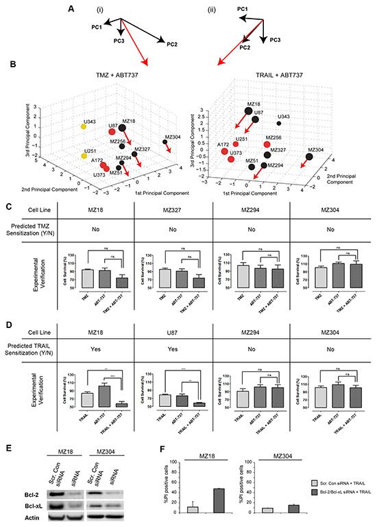Figure 5: Prediction and experimental validation of GBM cell line sensitization to TRAIL or TMZ treatment by ABT-737. A. A movement vector (red) was calculated by combining the weightings for the (Bcl-2+Bcl-xL+Mcl-1) functional group in the first 3 PCs. (i) and (ii) provide different perspectives on the vectors, compatible with 3D PC spaces for TMZ or TRAIL responsiveness. B. 3D PC spaces for TMZ and TRAIL responsiveness with movement vectors applied to test cell lines. The length of the movement vectors was calculated from the respective Bcl-2 and Bcl-xL content of the cell lines. Movement of treatment resistant cell lines towards regions populated by cell lines with higher treatment responsiveness predicts sensitization by the Bcl-2/Bcl-xL antagonist ABT-737. C, D, E. Experimental validation of predictions. Cell viability was measured for single and combination treatments. (C) Cells were treated with TMZ (150 µM) ± ABT-737 (1 µM) for 48 h. (D) Cells were treated with TRAIL (100 ng/ml) ± ABT-737 (1 µM) for 48 h. Data show cell viability (mean ± SEM from n = 3 independent experiments) in relation to untreated controls (100%). One-way ANOVA with Bonferroni comparisons was performed for statistical analysis. **p<0.01, ***p<0.001. ns = not significant. (E) Western blot analysis to confirm the successful knockdown of Bcl-2 and Bcl-xL. MZ18 and MZ304 cells were transfected with Bcl-2 and Bcl-xL esiRNA. F. siRNA depletion of Bcl-2 and Bcl-xL strongly sensitizes MZ18 but not MZ304 cells to TRAIL. Data show the number of PI+ cells (mean ± S.D. from triplicate samples) following treatment with TRAIL (100 ng/ml). Experiments were repeated with similar results.