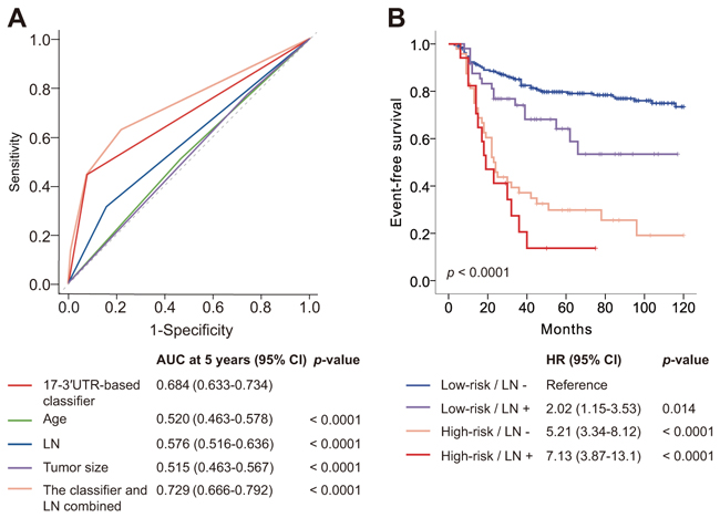 Figure 3: Time-dependent ROC curves compare the prognostic power of the 17-3′UTR-based classifier with clinicopathological risk factors, and Kaplan–Meier survival analysis for patients stratified by the classifier and lymph node status. ROC=receiver operator characteristic. AUC=area under the curve. A. Comparisons for the prognostic accuracy by the 17-3′UTR-based classifier (high risk vs low risk), age (≤50 years vs >50 years), lymph node status (positive vs negative), tumor size (≤2 cm vs >2 cm), or the classifier and lymph node status combined. B. Kaplan–Meier survival analysis shows significant difference among the four groups: low-risk/LN- (n = 211), low-risk/LN+ (n = 51), high-risk/LN- (n = 48), high-risk/LN+ (n = 17).
