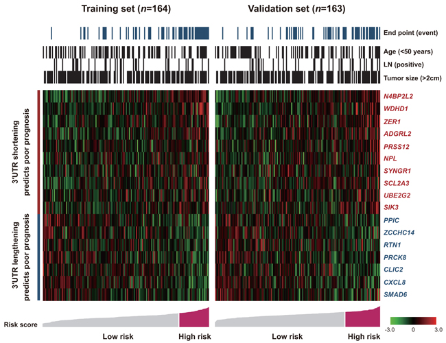 Figure 4: Shortening and lengthening patterns for the 3′UTR markers, patient outcomes and risk scores. Risk groups were defined by the risk score with the most significant (log-rank test) split of the training samples.