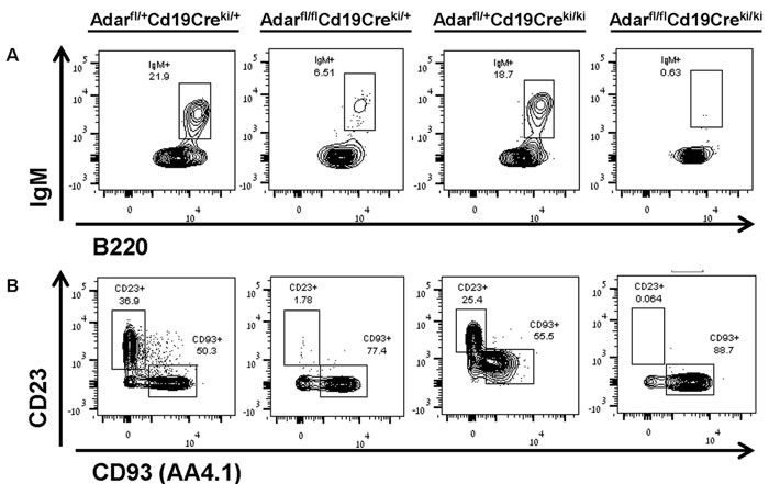 Figure 1: Cd19-Cre-mediated Adar disruption causes profound deficiency of immature and recirculating mature B cells in the BM. Single cell suspension of BM cells were obtained from 8-16 week-old mice and depleted of erythrocytes. Next, to identify B cell precursors in the last stages of B-lymphopoiesis we immunostained the samples with flourochrome-conjugated mAbs as detailed in Materials and Methods. Samples were acquired by a FACSAria instrument and the data ( > 10,000 events per sample) were analyzed/plotted using the FlowJo V.10 software. A. Upper contour plots depict the percentage of immature IgM+ B cells in the indicate group (21.9. 6.51, 18.7 and 0.63, respectively). B. Lower plots show the percentage of MR CD23+CD93- B cells in the indicate group (36.9, 1.78, 25.4, and 0.064; respectively) and other less mature B-lineage cells (50.3, 77.4, 55.5, and 88.7; respectively). The data shown are from a representative mouse from each of the four indicated genotypes.