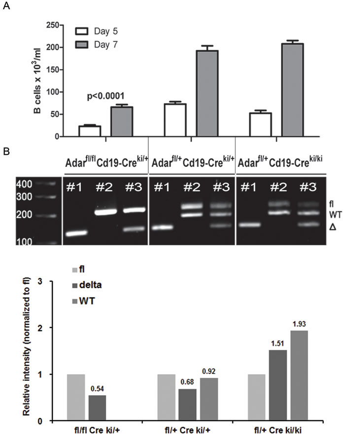 Figure 3: B cell precursors from Adarfl/flCd19-Creki/+ display a significantly reduced capacity for IL-7-dependent generation of CD19+ B cells in vitro. A. Bone marrow cells supplemented with rhIL-7 were cultured for 5 or 7 days, as described in methods. Cells were harvested, at the indicated time points, and absolute number of CD19+ B cells per mL was determined by FACS with the 123count eBeads kit. BM cultures were done in triplicates and bar graphs depict mean (±SD) from a representative experiment out of > 3 performed. Absolute CD19+ B cell counts in BM cultures of Adarfl/flCd19-Creki/+ mutants were significantly lower (p < 0.0001 by one-way ANOVA test) compared to the other groups at both time points. B. At the end of BM cultures (day 7), purified DNA from each respective sample was analyzed by PCR to detect relative quantity of either the Adar ∆ allele (lane 1), wt & fl alleles (lane 2), or all the three alleles simultaneously (lane 3). The image was acquired using a Molecular Imager ChemiDoc XRS+ system, and the densitometry analysis of the bands intensity was done using the Image Lab 5.1 software (BioRad Laboratories, Inc.).