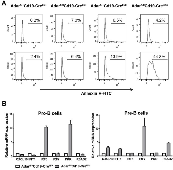 Figure 4: Cd19-Cre dependent disruption of Adar leads to apoptosis and type-I interferons response. A. Histograms depict FACS analysis of Annexin V staining of pre-B cells (upper panel) and immature B cells (lower panel) following overnight in vitro incubation. C. Pro-B cells and pre-B cells were isolated from BMs by a FACSAria sorter, and total RNA was purified from the cells as detailed in Methods. Next, we measured by qRTPCR the relative mRNA expression of the indicated ISGs. Bar graphs depict mean of triplicates (± SD), as calculated by the ∆∆CT method, normalized to Gapdh gene expression. Data show a representative experiment out of three performed.