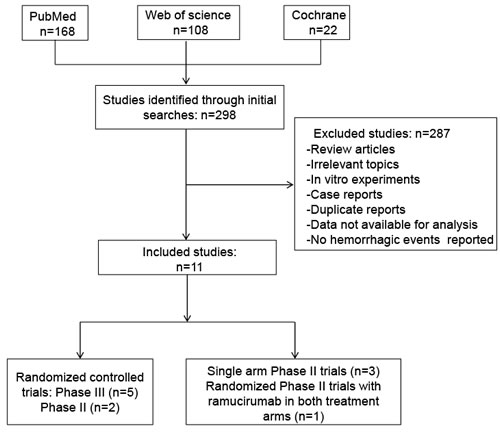 VEGF/VEGFR2 inhibitors have a unique series of adverse events, which are quite different from traditional cytotoxic agents. Similar to other antiangiogenic agents (bevacizumab, aflibercept, and multitargeted antiangiogenic tyrosine kinase inhibitors), hemorrhagic events (epistaxis, gastrointestinal hemorrhage/bleeding and pulmonary hemorrhage) are one kind of the major adverse events reported in clinical trials of ramucirumab. Hemorrhagic events may cause severe outcomes, some could be life-threatening, leading to the limited usage of ramucirumab, thus the recognition and management of hemorrhagic events in cancer patients who are receiving ramucirumab are seriously important issues [9]. However, the overall incidence and relative risk (RR) of hemorrhagic events with ramucirumab have yet to be defined. Therefore, we conducted a systematic review and meta-analysis of available clinical trials to determine the incidence and RR of hemorrhagic events in cancer patients treated with ramucirumab.