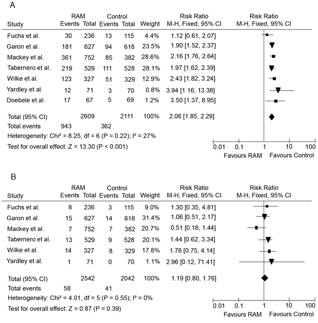 Figure 3: Forest plots of relative risks of low-grade and high-grade hemorrhagic events in cancer patients treated with ramucirumab versus control. A., relative risk of low-grade hemorrhagic events; B., relative risk of high-grade hemorrhagic events.