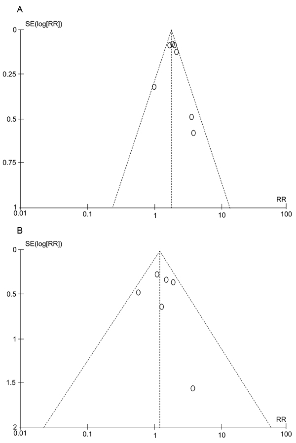 Figure 4: Funnel plots for relative risks of included studies in the meta-analysis. A., low-grade hemorrhagic events in cancer patients treated with ramucirumab; B., high-grade hemorrhagic events in cancer patients treated with ramucirumab.
