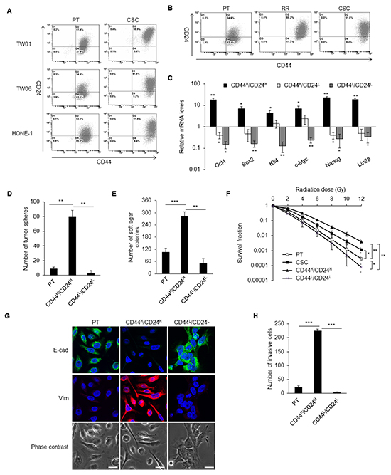 Figure 1: CD44high/CD24high cells with CSC properties. A. The dot plots represent the expression pattern of CD44 and CD24 in three NPC cell lines analyzed by flow cytometry. Left panels are parental cells (PT) and right panels are CSCs. Expression of CD44 and CD24 were higher in the CSCs than in the parental cells in all three NPC lines. B. The percentage of CD44high/CD24high cells gradually increased during selection process from parental cells (PT), radioresistant clones (RR) to CSCs. The shown data is from TW06 cell line. C. The expressions of stemness-associated genes in TW01 CD44high/CD24high cells were higher than CD44high/CD24low cells, CD44low/CD24low cells and the parental cells. Results were got through qPCR analysis, normalized with the mRNA expression level of 18S rRNA and compared with parental NPC cells. D. TW01 CD44high/CD24high cells had higher spherogenesis capacity compared with parental cells and CD44low/CD24low cells. E. TW01 CD44high/CD24high cells possessed higher clonogenic formation capacity compared with parental NPC cells and CD44low/CD24low cells as revealed by soft agar assay. F. Both TW01 CD44high/CD24high cells and CSCs exhibited higher radioresistant capacity compared with parental cells and CD44low/CD24low cells. G. The epithelial type of TW01 parental cells and CD44low/CD24low cells and mesenchymal type of TW01 CD44high/CD24high cells were differentiated evidently by immunostaining. Scale bars indicate 20 μm. H. TW01 CD44high/CD24high cells had the greatest invasion ability among parental cells and CD44low/CD24low cells. These results are representative of 3 independent experiments. CD44H/CD24H: CD44high/CD24high cells, CD44H/CD24L: CD44high/CD24low cells, CD44L/CD24L: CD44low/CD24low cells. (*: p<0.05; **: p<0.01; ***: p<0.001).
