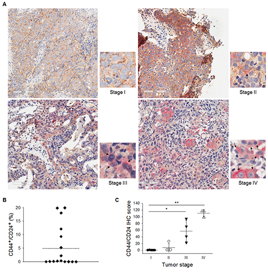 Figure 2: Clinical evidences of CD44high/CD24high as a malignancy indicator. A. Immunohistochemical double-staining of of CD44 and CD24 were performed in primary NPC samples. CD44/CD24 co-expressed cells were detected mainly in stages III and IV NPC sample. CD44 was stained with diaminobenzidene (DAB, brown color) and CD24 with Permanent Red (red color). Hematoxylin was used for nuclear stain. Black arrows indicate cells with co-expression of CD44 and CD24. B. The percentage of CD44+/CD24+ cells in the NPC specimens ranged from 0% to 19.9%. Dotted line indicates the average value. C. Increased co-expression of CD44 and CD24 was correlated with the clinical stages of NPC after further scoring. Dotted lines indicate the average values. (*: p<0.05; **: p<0.01).