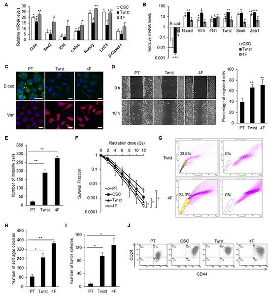 Figure 3: EMT and stemness factors could generate CD44high/CD24high iCSCs in NPC. A. qPCR confirmed the comparable upregulation of stemness genes in TW01 CSCs, Twist-iCSCs, and 4F-iCSCs. Results were normalized with the mRNA expression level of 18S rRNA and compared with those of the parental NPC cells. Twist: Twist-iCSCs; 4F: 4F-iCSCs. B. Comparable upregulation of EMT genes in TW01 CSCs, Twist-iCSCs, and 4F-iCSCs shown by qPCR. Results were normalized with the mRNA expression level of 18S rRNA and compared with those of the parental NPC cells. C. Immunofluorescence staining indicated the repression of epithelial (E-cad) and upregulation of mesenchymal (Vim) markers in TW01 Twist-iCSCs and 4F-iCSCs. D. Wound healing assay depicted higher migratory ability of TW01 Twist-iCSCs and 4F-iCSCs compared with the parental cells. Right panel showed the quantified percentage of migrated cells at 10 hours post-wounding. E. Transwell cell invasion assay showed higher invasion capacity of TW01 Twist-iCSCs and 4F-iCSCs compared with the parental cells. F. TW01 CSCs, Twist-iCSCs, and 4F-iCSCs had higher radioresistance capacity than parental cells. G. TW01 Twist-iCSCs had 33.8% and TW01 4F-iCSCs had 34.3% of side population cells. Left dot plot, iCSCs were incubated with Hoechst33342; right plot, iCSCs were pre-incubated with Fumitremorgin C to block the efflux of Hoechst33342. H. Soft agar assay indicated that TW01 Twist-iCSCs and 4F-iCSCs had higher clonogenic formation capacity than did the parental cells. I. TW01 Twist-iCSCs and 4F-iCSCs exhibited higher tumor sphere formation capacity than did the parental cells. J. TW01 CSCs, Twist-iCSCs, and 4F-iCSCs possessed more CD44high/CD24high surface antigen phenotype than did the parental cells as measured by flow cytometry. These results are representative of 3 independent experiments. (*, p<0.05; **, p<0.01; ***, p<0.001).
