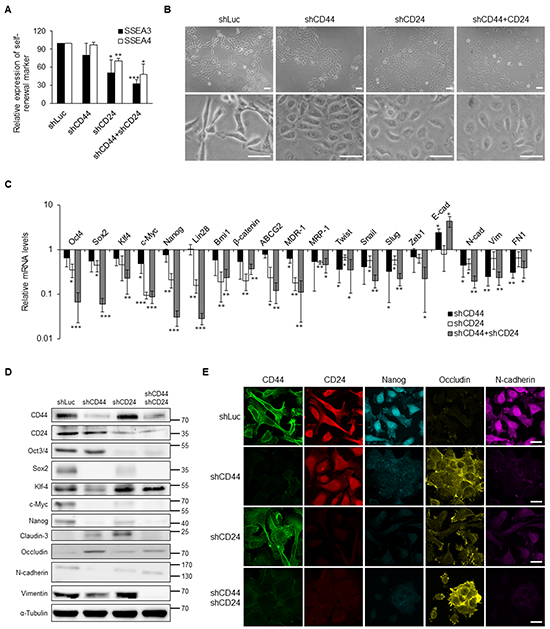 Figure 4: Suppression of stemness and EMT expression via knockdown of CD44 and CD24 in NPC CSCs. A. CD44 and CD24 knockdown resulted in the decrease of SSEA3 and SSEA4 expression in TW01 CSCs as measured by flow cytometry. B. TW01 CSCs underwent mesenchymal-to-epithelial transition after CD44 and CD24 knockdown. Lower panals are 3.5-fold magnified images for a closer look of indicated cells. Scale bars indicate 50 μm. C. Knockdown of CD44 and CD24 altered the expression levels of indicated genes measured by qPCR in TW01 CSCs. Results were normalized with the mRNA expression level of 18S rRNA and normalized to TW01 CSCs transfected with shLuc. D. Depletion of CD44 and CD24 suppressed the stemness and EMT markers in TW01 CSCs as measured by western blot. α-tubulin served as internal control. E. Knockdown of CD44 and CD24 hindered the stemness and EMT markers in TW01 CSCs as measured by immunofluorescence staining. Scale bars indicate 20 μm. These results are representative of 3 independent experiments. shLuc: cells infected with shRNA-luciferase (shLuc) construct as the negative control. (*: p<0.05; **: p<0.01; ***: p<0.001).
