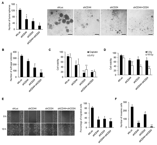 Figure 5: Knockdown of CD44 and CD24 suppresses CSC behavors. A–B. Knockdown of CD44 and CD24 resulted in decrease of (A) tumor sphere formation and (B) colony formation in TW01 CSCs. Scale bars indicate 100 μm. C–D. The sensitivities of cancer cells to (C) chemicals (8 μM cisplatin; 10 μM 5-fluorouracil, 5-FU) and to (D) radiation (5 Gy and 10 Gy) were increased in TW01 CSCs after knockdown of CD44 and CD24 as measured by cell viability assay. E. Wound healing assay showed that CD44 and CD24 depletion suppressed the migration capacity of TW01 CSCs. Right panel depicted the quantified percentage of migrated cells at 10 hours post-wounding. F. Transwell invasion assay revealed the reduction of invasion capacity of TW01 CSCs with CD44 and CD24 knockdown. These results are representative of 3 independent experiments. (*: p<0.05; **: p<0.01).