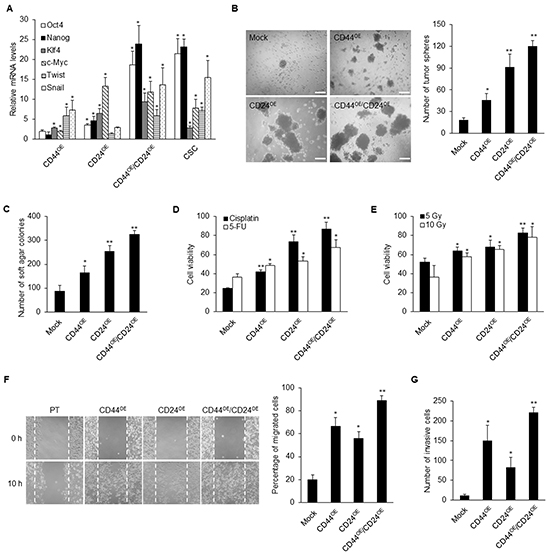 Figure 6: Ectopic expressions of CD44 and CD24 reprogram NPC parental cells. A. Stemness genes including Oct4, Nanog, Klf4 and c-Myc, as well as EMT-related genes such as Twist and Snail, were up-regulated in CD44 or CD24 or co-overexpressed TW01 cells when compared with parental cells as determined by real-time RT-PCR. Results were normalized with the mRNA expression level of 18S rRNA and normalized to mock-transfected TW01 parental cells. B. The number of tumor spheres in CD44/CD24 co-overexpressed TW01 cells was higher than in CD44 or CD24 single overexpressed cells and parental cells. Left images depict the sphere morphology of indicated cells. Scale bars indicate 200 μm. C. The number of soft agar colonies in CD44/CD24 co-overexpressed TW01 cells was higher than in CD44 or CD24 single overexpressed cells and parental cells. D–E. The numbers of viable cells in CD44/CD24 TW01 co-overexpressed cells were significantly increased under (D) cisplatin or 5-FU treatment or (E) irradiation treatment. F–G. CD44/CD24 co-overexpressed TW01 cells possessed the highest (F) migration capacity and (G) invasive capacity compared with other groups. Right panel shown in (F) indicated the quantified percentage of migrated cells at 10 hours post-wounding. These results are representative of 3 independent experiments. Mock: TW01 parental cells with mock-infected; CD44OE: TW01 parental cells with CD44 overexpression; CD24OE: TW01 parental cells with CD24 overexpression; CD44OE/CD24OE: TW01 parental cells with both CD44 and CD24 overexpression; CSC: TW01 cancer stem cells isolated by behavior selection. (*: p<0.05; **: p<0.01).