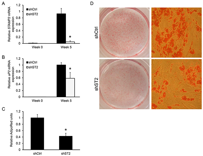 Figure 2: Knockdown of STAMP2 suppresses ASC adipogenesis. A-B. ASCs expressing a non-silencing shRNA (shCtrl) or shRNA against STAMP2 (shST2) were harvested at the indicated time points of differentiation and subjected to qRT-PCR analysis. The figures show the mRNA expression of STAMP2 (A) and aP2 (B) normalized to the reference gene GAPDH. The results are from three independent experiments, n = 10. *p<0.05 comparing shST2 to shCtrl. C. AdipoRed assay with differentiated ASC shCtrl and ASC shST2 (Week 5). D. Oil Red O staining of differentiated ASC shCtrl and ASC shST2 (Week 5). The images are representative for three independent experiments.