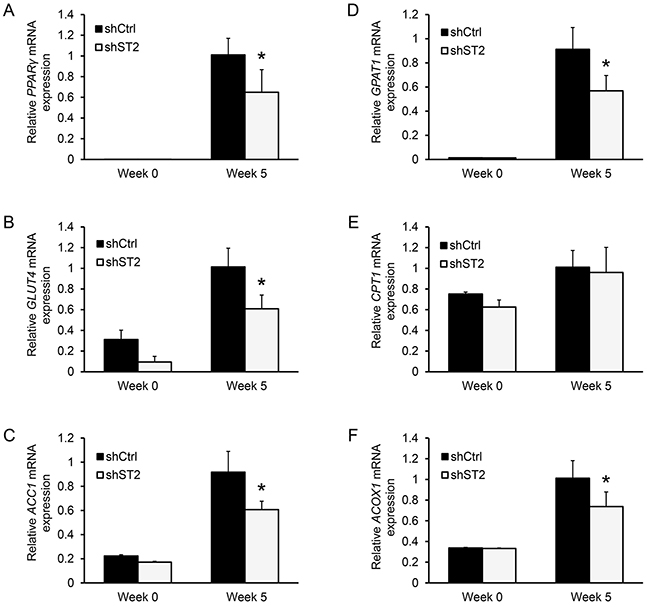 Figure 3: Knockdown of STAMP2 affects the expression of genes involved in energy uptake, lipid synthesis, and storage. A-F. ASCs expressing non-silencing shRNA (shCtrl) or shRNA against STAMP2 (shST2) were harvested at the indicated time points of differentiation and subjected to qRT-PCR analysis. The figures show the mRNA expression of PPARγ (A), GLUT4 (B), ACC1 (C), GPAT1 (D), CPT1 (E), and ACOX1 (F) normalized to the reference gene GAPDH. The results are from three independent experiments, n = 10. *p<0.05 comparing shST2 to shCtrl.
