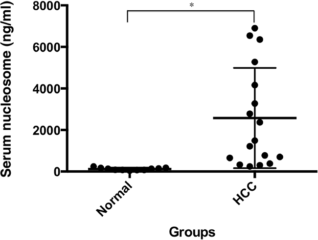 Figure 1: Serum nucleosomal levels are significantly increased in HCC patients. Serum nucleosome levels were measured using ELISA in HCC patients (n=17) and healthy individuals (n=11). *p < 0.01.