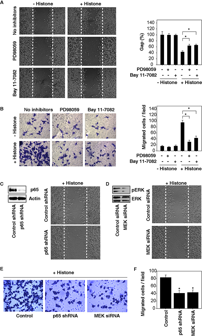 Figure 4: Activation of the MAPK/ERK-NF-κB pathway contributes to histone-induced HCC cell migration and invasion. A. Both MEK (PD98059, 20 μM) and NF-κB (Bay11-7082, 10 μM) inhibitors suppressed histone (50 μg/ml, 24 hours)-induced Hepa1-6 cell migration A. and invasion B. (n=3, *, p<0.05). C-F. Knockdown of p65 and MEK by RNAi inhibited histone (50 μg/ml, 24 hours)-induced HCC cell migration (C, D) and invasion (E, F) (n=3, *, p<0.05, versus control group).