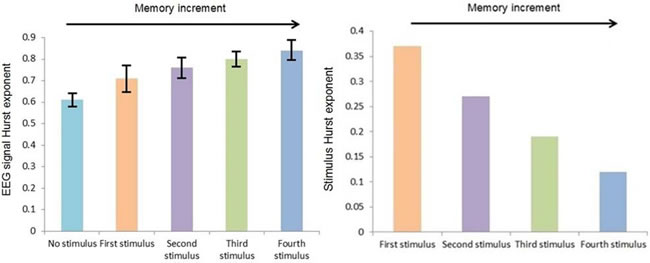 As can be seen in Table 7, the Hurst exponent for the first stimulus (H = 0.37) is larger than for the second stimulus (H = 0.27), which itself is larger than for the third stimulus (H = 0.19), which itself is larger than for the fourth stimulus (H = 0.12). As was mentioned before, the value of the Hurst exponent that is closer to 0.5 indicates a lower memory content. Thus, the first stimulus has a lower memory content than the second stimulus, which itself has a lower memory content than the third stimulus, which itself has a lower memory content than the fourth stimulus. In case of approximate entropy, as we move from the first to the forth stimulus, the randomness decreases and accordingly approximate entropy decreases.
