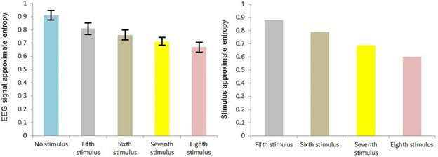 As can be seen in Table 8, the Hurst exponent for the eighths stimulus (H = 0.93) is larger than for the seventh stimulus (H = 0.86), which itself is larger than for the sixth stimulus (H = 0.78), which itself is larger than for the fifth stimulus (H = 0.69). As was mentioned before, the value of the Hurst exponent that is closer to 0.5 indicates a lower memory content. Thus, the fifth stimulus has a lower memory content than the sixth stimulus, which itself has a lower memory content than the seventh stimulus, which itself has a lower memory content than the eighth stimulus. In case of approximate entropy, as we move from the fifth to the eighth stimulus, the randomness decreases and accordingly approximate entropy decreases.