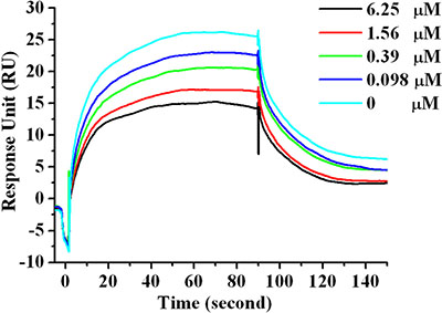 Figure 2: SPR competitive binding curves with increasing Ar5Y_4 concentrations (0 μM, 0.098 μM, 0.39 μM, 1.56 μM, 6.25 μM) with hPD-L1 immobilized on the sensor chip for investigating the ability of Ar5Y_4 blocking the interaction of hPD-1 and hPD-L1. Pre-incubation of Ar5Y_4 with hPD-1 effectively inhibits the binding of hPD-L1 to hPD-1.