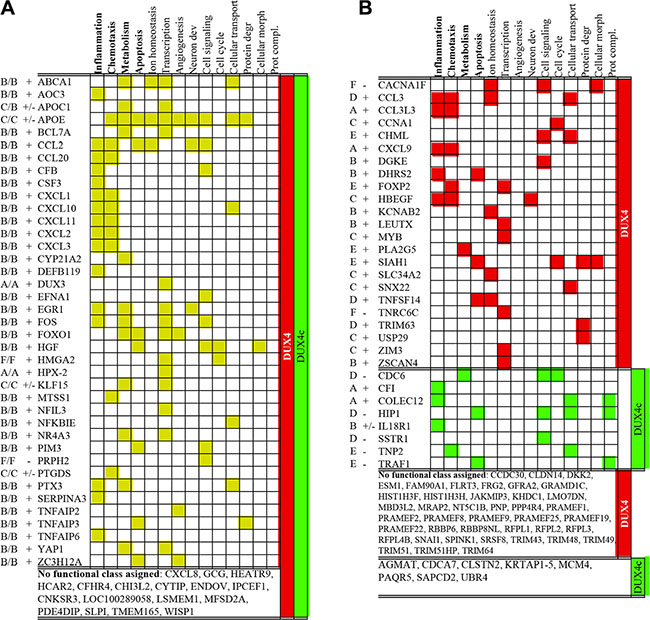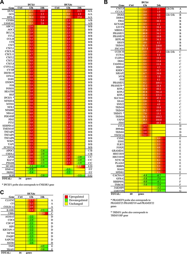 Figure 1: Genes differentially expressed 12- and 24 h after the transfection of human immortalized myoblasts (MB) with DUX4 or DUX4c plasmids as compared to empty vector; yellow: no differential expression (-1.5 < FC < 1.5); red: upregulated (FC > 1.5); green: downregulated (FC < -1.5). (A) Genes differentially expressed in both DUX4- and DUX4c-transfected MB; genes upregulated at both 12 h and 24 h, only at 12 h or 24 h time-points are labeled with (A, B and D) respectively; genes upregulated at 12 h but downregulated at 24 h time-point are labeled with C; genes downregulated at both 12 h and 24 h, only at 12 h or 24 h time-points are labeled with (E, F and G) respectively. (B) Genes differentially expressed only in DUX4-transfected MB; genes upregulated at both 12 h and 24 h time-points with the expression level at 12 h higher, equal or lower than at 24 h are labeled with (A, B or C) respectively; genes upregulated only at 12 h or 24 h time-points are labeled with D and E respectively; genes downregulated at both time-points or only at 24 h time-point are labeled with F and G respectively. (C) Genes differentially expressed only in DUX4c-transfected MB; genes upregulated at 12 h or 24 h or downregulated at 12 h or 24 h time-points are labeled with A, C, D and E respectively; genes upregulated at 12 h but downregulated at 24 h time-points are labeled with B.