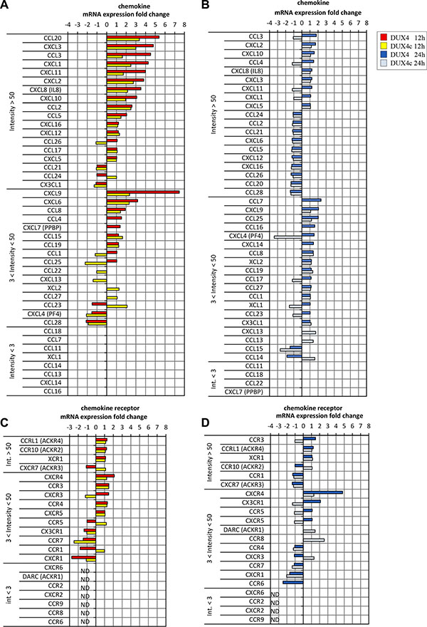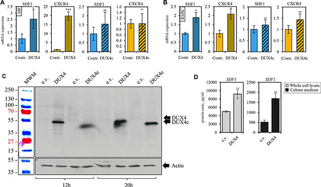 To better understand the mechanism of DUX4 impact on the cell, we performed transcriptome profiling of human primary myoblasts overexpressing full-length DUX4 and DUX4c. One of the most striking findings of this analysis was an apparent upregulation of a significant number of chemokine genes. Chemokines is a superfamily of vertebrate-specific protein ligands interacting with rhodopsin-like G-protein-coupled receptors (GPCRs) [25]. The primary role of chemokines is the control of leukocyte traffic and recruitment to inflamed tissues (for review see [26–30]). Some of constitutively produced chemokines are known to play a role in processes unrelated to innate or acquired immunity (for review see [31–32]). Of these, CXCL12 (C-X-C motif ligand 12), also known as Stromal-derived factor 1 (SDF1) [33]) and its primary receptor CXCR4 (C-X-C motif Receptor 4) [34] clearly stand apart due to an important role in development regulation [35], hematopoiesis, angiogenesis [36–37], stem cell migration [38] and wound healing (reviewed in [39–40]). In addition, CXCR4 is one of the major GPCR receptors controlling the migration of various cell types including leukocytes, HSPC, MSC (reviewed in [41].