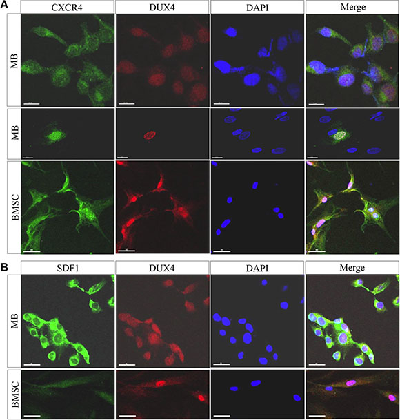 MSC (mesenchymal stem or mesenchymal stromal cells) are multipotent stem cells capable of differentiation into chondrocytes, osteocytes, adipocytes and, more controversially, to other cell types (for review see [42]). The primary site of MSC localization is bone marrow, although cells with similar properties were also found in other tissues (for review see [43]). In adult organism, MSC are thought to contribute to tissue homeostasis. Tissue damage results in MSC mobilization from bone marrow and their homing to damaged tissue where they either differentiate to replenish damaged cells, stimulate differentiation of the tissue-resident stem cells, stimulate vascularization and control inflammation thus restoring the damage (reviewed in [44]). CXCR4-SDF1 signaling is known to be required for MSC homing and retention to their niche in bone marrow (for review see [43]) and has also been shown to stimulate MSC cell migration in vitro [45, 46]. We have shown that DUX4 overexpression results in upregulation of CXCR4 and SDF1 genes in several cell types and stimulates the migration of BMSC in a CXCR4- and SDF1-dependent manner. Our results thus establish DUX4 as a novel regulator of cell mobility.