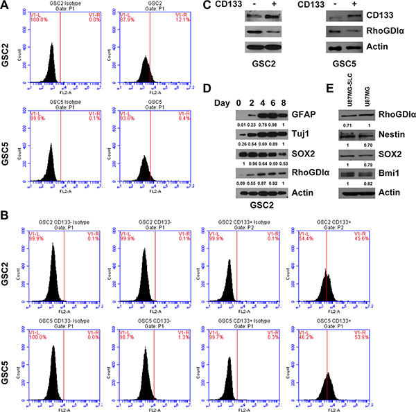 Figure 1: The RhoGDIα expression in GSCs. (A) FASC analysis of CD133 percentage before magnetic sorting. (B) FASC analysis of CD133 percentage after sorting of CD133− and CD133+ cells. CD133+ cells were isolated from GSC2 and GSC5 by magnetic beads, the percentage of CD133+ cells was determined by FASC analysis relative to cells labeled with IgG isotype control antibody. (C) Immunoblot analysis of RhoGDIα protein level in matched CD133− and CD133+ cell isolated from GSC2 and GSC5. (D) Immunoblot analysis of RhoGDIα, stem cell marker (SOX2) and differentiation markers (GFAP and Tuj1) during GSC2 differentiation. The numbers represent gray value relative to Actin. (E) Immunoblot analysis of RhoGDIα and stem cell markers (Nestin, SOX2 and Bmi1) in U87MG and U87MG-SLC cell. The numbers represent gray value relative to Actin.