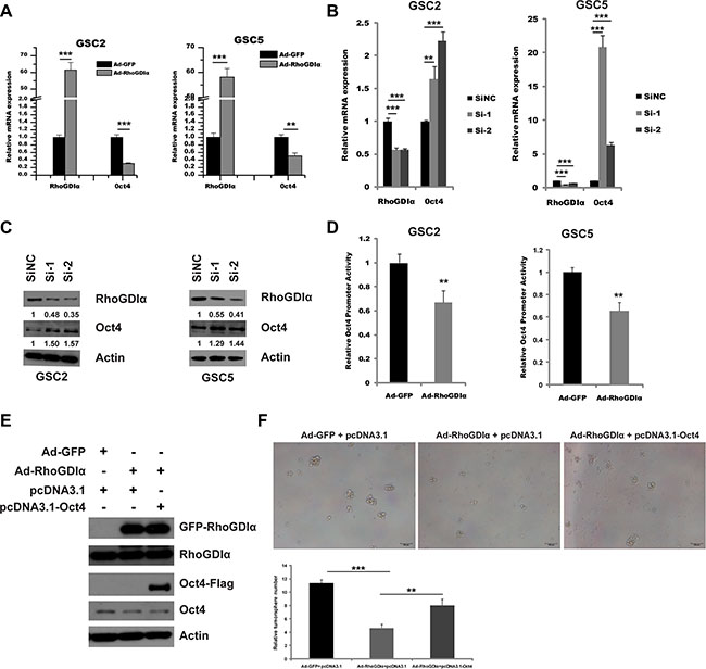 Figure 4: RhoGDIα suppressed Oct4 transcription. (A) qRT-PCR analysis of stemness-associated gene Oct4 in GSC2 and GSC5 infected with Ad-RhoGDIα and Ad-GFP adenovirus (control). (B) qRT-PCR analysis of stemness-associated gene Oct4 in GSC2 and GSC5 transfected with RhoGDIα siRNAs or siNC (control). (C) Immunoblot analysis of Oct4 protein levels in GSC2 and GSC5 transfected with RhoGDIα siRNAs or siNC (control). The numbers represent gray value relative to Actin. (D) Analysis of Oct4 promoter activity by luciferase reporter assay in GSCs in response to RhoGDIα ectopic expression. (E) Western blot analysis of RhoGDIα and Oct4 protein levels in GSC5 infected with Ad-RhoGDIα alone, or Ad-RhoGDIα plus pcDNA3.1-Oct4 transfection. (F) Tumorsphere formation assay of GSC5 after infection and transfection. Data are means ± SD, **p < 0.01, ***p < 0.001.
