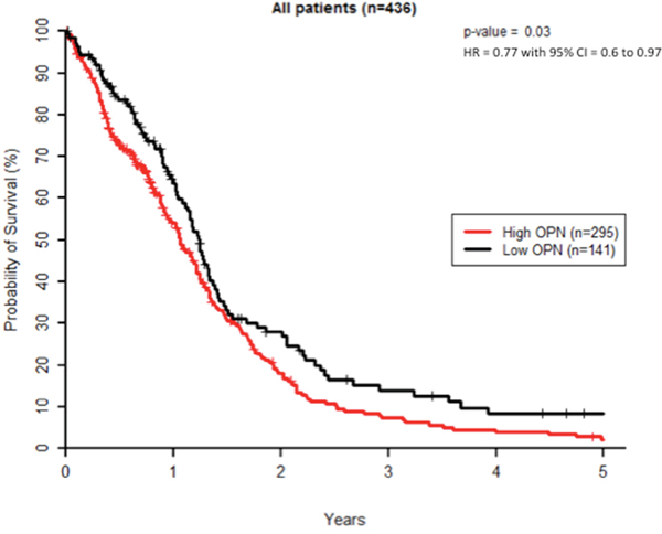 Figure 1: High OPN expression correlates with poor survival in GBM patients. Kaplan–Meier overall survival curves for GBM patients (n=436). These results were obtained using TCGA database as described under Materials and Methods section.