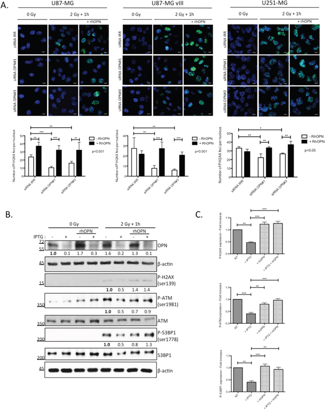 Figure 4: DNA damage repair markers inactivation in OPN-depleted GBM cells is rescued with soluble OPN. A. OPN-depleted U87-MG, U87-MG vIII and U251-MG cells (siRNA OPN#1 and #3) were supplemented with exogenous human recombinant OPN (rhOPN, 250 nM) and then exposed to a single dose of 2Gy. One hour post irradiation, cells were processed for P-H2AX immunostaining (upper panel). Magnification 630x. Scale bar = 10 μM. The number of P-H2AX foci per nucleus was quantified for each condition as described under Material and Methods section (lower panel). Data are presented as mean ± SEM of one representative experiment, n=3 including 6 cover slips for each condition. B. IPTG-inducible shOPN U87-MG cells were maintained 4 days in IPTG-containing medium (1 mM) in order to decrease OPN expression (+ IPTG). Cells were then exposed to a single dose of irradiation of 2 Gy and harvested one hour post irradiation. Total protein extracts was immunoblotted for phosphorylated and total DNA repair markers as indicated. Immunoblot data were quantified by densitometric analysis and normalized for β-actin. All immunoblots were repeated at least 3 times. C. Densitometric values of 3 independent experiments are represented in bar graphs as mean ± SEM for irradiated cells. ***, P<0.001. **, P<0.01. *, P<0.05.