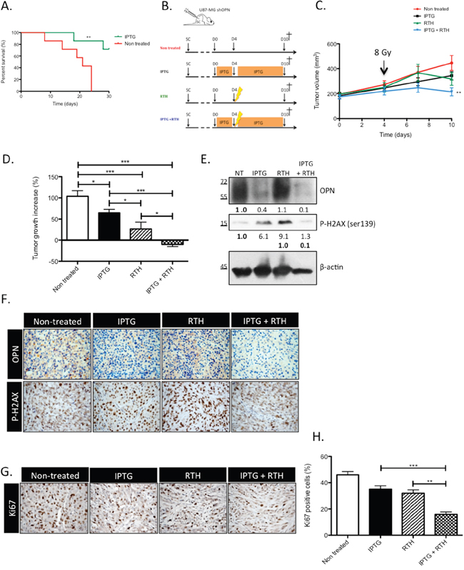 Figure 5: OPN knockdown improves the survival of GBM-bearing mice and induces a tumor shrinking when combined to radiotherapy by decreasing the response to irradiation. A. Kaplan-Meier survival plot of mice bearing IPTG-inducible shOPN U87-MG orthotopic tumors. Tumors were allowed to grow during 2 weeks. Then, mice were either non treated or treated with IPTG (20 mM) by daily IP injection and supplied with IPTG-containing drinking water (10 mM) to selectively knockdown OPN expression. n= 7 per group. **, P<0.001. B. Schematic representation of the treatment plan designed for tumor-bearing mice, as described under Material and Methods section, for the heterotopic model of injection. C. Subcutaneous tumors generated from IPTG-inducible shOPN U87-MG cells were allowed to reach a volume of 200 mm3. Mice from groups IPTG and IPTG + RTH were daily treated with IPTG by IP injection (20 mM) during 4 days. At day 4, mice from groups RTH and IPTG + RTH received a single-dose of ionizing irradiation of 8 Gy. Tumor volume was measured every 3 days. n= 8 for IPTG and RTH + IPTG conditions; n= 7 for non treated and RTH conditions. D. For each condition, tumor growth increase was evaluated by calculating the difference between the tumor volume at day 4 post IPTG treatment and at day 10. E. One hour post irradiation, one mouse of each group was sacrificed and tumors excised for total extraction protein and IHC. Immunoblots for OPN and P-H2AX detection are shown. Immunoblot data were quantified by densitometric analysis and normalized for β-actin. F. OPN and P-H2AX IHC staining was performed on the same tumors one hour post irradiation as in E. Magnification 100x. G. One week post irradiation, all mice were sacrificed and tumors were excised. Ki67 IHC was performed to assess proliferation in tumors. Magnification 100x. H. Quantification of Ki67 positive cells for each condition. Data are presented as mean ± SEM. ***, P<0.001. **, P<0.01. *, P<0.05.