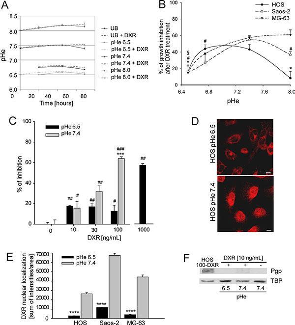 Figure 1: Chemoresistance induced by low pHe. (A) Measurement of pH of medium buffered at different pH and unbuffered (UB), over the culture period; (B) percentage of growth inhibition of osteosarcoma (OS) P-glycoprotein (P-gp) negative cells cultured at different pH and treated with Doxorubicin (DXR) (15 ng/mL) by direct cell counting. Growth inhibition was obtained in respect to the untreated condition at the respective pH (*p < 0.05 vs pH 7.4 for HOS; #p < 0.05 vs pH 7.4 for Saos-2; §p < 0.05 vs pH 7.4 for MG-63); (C) Percentage of growth inhibition of HOS P-gp negative cells at different concentrations of DXR under acidic conditions by viability indirect assay (***p < 0.001 vs pH 7.4 at the same concentration; #p < 0.05, ##p < 0.01, and ###p < 0.001 vs not treated at the same respective pH); (D) DXR nuclear compartmentalization in HOS P-gp negative cells maintained at different pH for 48 h, observation at the confocal microscope (Scale bars = 5 μm). (E) Fluorescence intensity of DXR in the nuclei of OS P-gp negative cells treated with 10 mg/mL DXR (****p < 0.0001); (F) western blotting analysis of Pgp expression in HOS P-gp negative cells at different pHe and treated or not treated with DXR for 30 days. HOS 100-DXR P-gp positive cells were used as positive control. HOS 100-DXR cells were obtained after continuous exposure to DXR for several months at pHe 7.4.