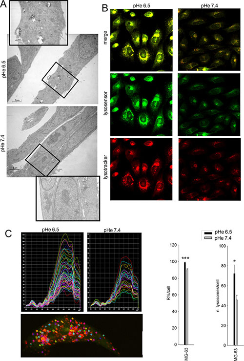 Figure 2: Lysosomes in cells under acidic conditions are more acidic and increased in number. OS cells were maintained for 48 h at different pHe before analyses. (A) trasmission electron microscopy of HOS cells (in the rectangles, a detail of the original image is enlarged); (B) lysosensor (green) and lysotracker (red) staining of HOS cells; (C) spectrum analysis of Acridine Orange (AO) emission in vesicle-like structure in HOS cells. AO is a probe for measuring pH gradients across membranes with particular specification to intravesicular acidification, with a trend of localization and subsequent accumulation and polymer formation (emission at 655 nm) in acidic compartment, and of monomer localization at higher pH (emission at 530 nm). Upper panels: representative graphs of the intensity of spectra of all the lysosomes within a cell at the two different pHe; lower panel: representative image of intracytoplasmic area examined; right panel: quantification of the lysosomal acidity by spectra analysis [R% = 100* I655/ (I655 + I530) where I655 and I530 are the green (520–540 nm) and the red (645–665 nm) integrated emission intensities, ***p < 0.0001 vs pHe 7.4)], and number of acidic vesicles within a cell (*p < 0.05 vs pHe 7.4).