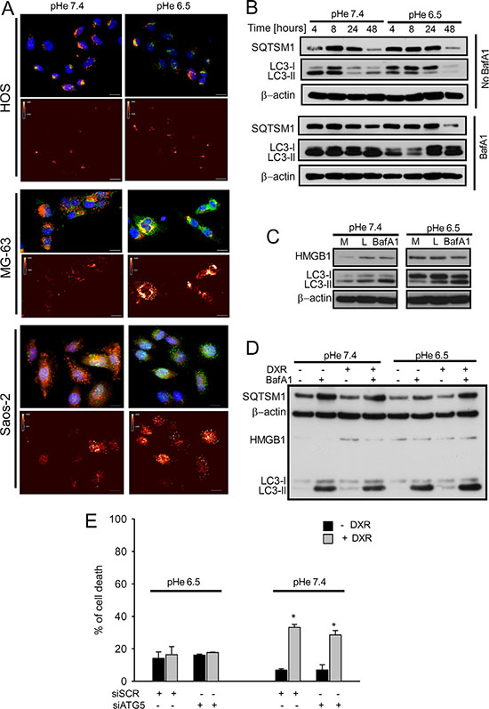 Figure 3: Autophagic flux was unaffected in OS cells cultured under acidic conditions. (A) Upper panel: LC3-B immunostaining (green), with LysoTracker staining (red), and nuclei staining (blue) under different pH (scale bar 10 μm). Lower panel: false color for LC3-B staining showed in the upper panel; (B) analysis of autophagic flux by western blotting of LC3B and SQTSM1 expression of HOS cells cultured at pH 7.4 and 6.5 at different pH and at different time-points (4-8-24-48- hrs) in presence of absence of BafA1treatment (50 nM) for 2 h before collection; (C) western blot analysis of proteins related to the autophagic flux HMGB1 and LC3-II in HOS cells cultured at pH 7.4 and 6.5, in presence of BafA1 (50 nM) for 2 hrs before collection, or of the lysosomal inhibitors (L, Pepstain A/E64d) treatments at 10 μg/mL, or with complete medium (M); (D) western blot analysis HMGB1, LC3-II, and SQTSM1 in HOS cells treated for 24 h with DXR, in presence or absence of BafA1 at different pH (7.4 and 6.5); (E) evaluation of the effect of the silencing of autophagic protein ATG5 on HOS cell death, under acidic conditions in HOS cells (*p < 0.05 vs not treated cells at the respective pH).