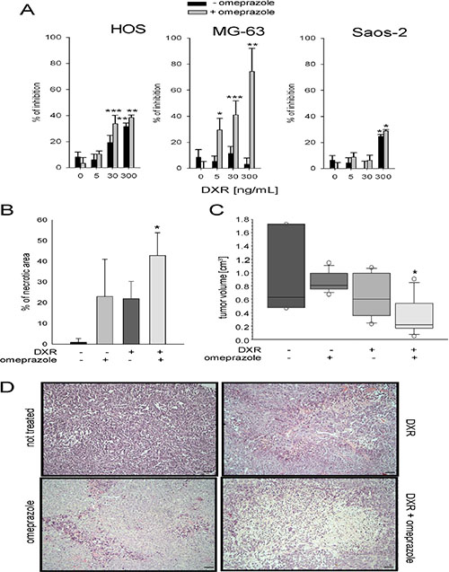 Figure 4: Lysosomal targeting enhanced DXR cytotoxicity. (A) Cells were treated with DXR for 48 h under acidity following pretreatment of 2 h with (+ OME) or without (- OME). The percentage of inhibition was obtained by an indirect viability assay (*p < 0.05, **p < 0.01, and ***p < 0.001 vs not DXR treated cells, at the respective +OME or – OME condition); (B) percentage of necrotic area in a mouse model of OS treated with DXR in combination or not with OME (*p < 0.05 vs non treated group); (C) Tumor volume in the same xenografts (*p < 0.05 vs non treated group); (D) ematoxylin & eosin staining of xenograft sections, representative images (scale bar = 100 micrometers).