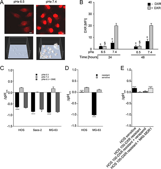 Figure 5: Total DXR concentration in HOS cells under acidity is reduced due to an increased pH gradient (ΔpHcm ) at the plasma membrane. (A) 3D intensity embossed and confocal acquisition of DXR fluorescence in the DXR intracellular uptake assay by NIS Element software (Nikon) in HOS cells cultured under different pH, representative image (scale bar = 10 μm); (B) cytofluorimetric quantification of DXR uptake in HOS cells cultured under different pHe (*p < 0.05 not treated vs the DXR treated, at the same pHe; § p < 0.05 DXR treated at pHe 6.5 vs the DXR treated at pH 7.4). MFI, Mean Fluorescence Intensity. (C) ΔpHcm plasma membrane gradient by SNARF staining of live cells cultured under acidic conditions, treated or not treated with OME, and measured by spectral confocal microscopy (****p < 0.0001 vs pHe 7.4, #p < 0.05 vs pHe 6.5, n = 12). The uncharged SNARF-1-AM can passively diffuse across the plasma membrane to cytosol, where it hydrolyzed by cellular esterases to free SNARF-1. It is this form that is fluorescent, and is consequently the intracellular pH probe. Intracellular pH measurement and pH calibration using single excitation-dual emission fluorescence ratios were performed as described in the method paragraph; (D) ΔpHcm plasma membrane gradient by SNARF staining of live resistant cells cultured at pHe 7.4 and that express P-gp protein (****p < 0.0001 vs sensitive cultured at pHe 7.4, n = 12); (E) ΔpHcm plasma membrane gradient by SNARF staining of live HOS resistant cells (HOS 100-DXR), cultured at pHe 7.4, and treated or not treated with verapamil or with a monoclonal blocking antibody against MDR-1 (****p < 0.0001 vs resistant cells).