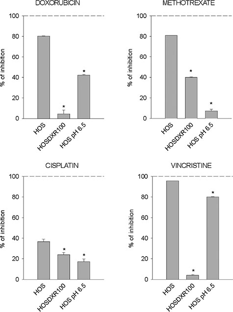 Figure 6: Chemoresistant phenotypes of OS cells cultured at different pHe and treated with different drugs. Percentage of inhibition of cell viability of HOS cells cultured at pH 7.4, of P-gp expressing HOS cells (HOS 100-DXR), and of HOS cells cultured at pH 6.5 treated with different drugs, as measured by acid phosphatase assay after 72 h (*p < 0.05 vs HOS cells cultured at pH 7.4 and treated with the respective drug).