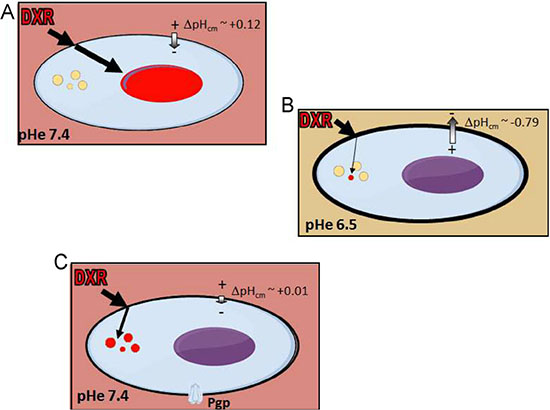Figure 7: ΔpHcm at the plasma membrane is an important player in OS chemoresistance. (A) When OS cells growth in a microenvironment with pHe 7.4 and with an unaffected system to maintain the pHi, DXR accumulates into the nucleus; (B) when OS cells growth in a microenvironment with pHe around 6.5, the ΔpHcm is reverted and DXR does enter into the cell. Only a very small fraction of DXR reaches the cytoplasm, and is immediately sequestered into lysosomes that, under this condition, are even more acidic; (C) when OS cells growth in a microenvironment with pHe 7.4 and express Pgp, the system to maintain the pHi is altered, membrane potential is reduced, and lysosomes are more acidic. As a result, although DXR can reach the cytoplasm, it is immediately sequestered into lysosomes.