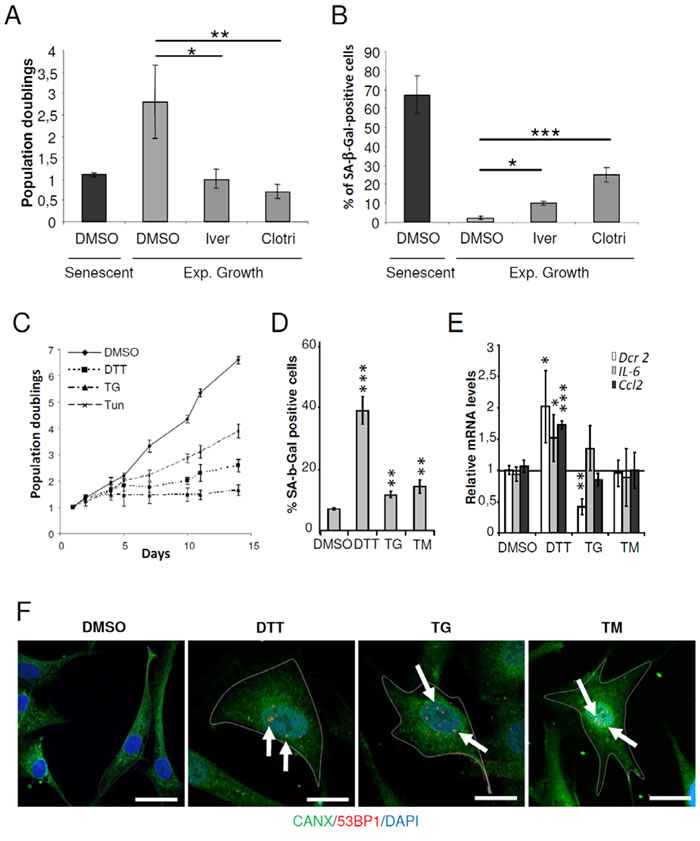 Figure 1: ER stressors accelerated the senescent phenotype in NHDFs. A. Exponentially growing NHDFs were treated with clotrimazole (10μM) or ivermectin (2μM) for 4 days. The proliferation rate was determined by cell counting. Each condition was tested in triplicate. The bar chart represents the mean ± SD of 3 independent experiments. B. Exponentially growing NHDFs were treated as in (A) and the percentage of SA-β-Gal-positive cells was determined. SA-β-Gal positive cells were counted in 3 different microscopic fields. The bar chart represents the mean ± SD of the 3 counts. C. Exponentially growing NHDFs were treated with DTT (200 µM), TG (0.1 µM), or TM (0.005 µM), and counted up to 10 days after the beginning of the treatment and cumulative doubling numbers were calculated. Results are representative of three independent experiments performed in triplicate. D. Exponentially growing NHDFs were treated with DTT (200 µM) for 4 days, TG (0.1 µM) for 3 days, or TM (0.01 µM) for 3 days and the percentage of SA-β-Gal-positive cells was determined. SA-β-Gal positive cells were counted in 3 different microscopic fields. The bar chart represents the mean ± SD of the 3 counts. E. Exponentially growing NHDFs were treated as in (D) and the senescent markers DCR2, IL6, CCL2 were measured at the mRNA levels by qRT-PCR and were normalized to EAR levels. The measures were performed in triplicate. The bar chart represents the mean ± SD of three independent experiments. F. Exponentially growing NHDFs grown on coverslips were treated with DTT (200 µM) for 4 days, TG (0.1 µM) for 3 days, or TM (0.005 µM) for 4 days, fixed, and processed for immunofluorescence detection of endogenous protein CANX (green) and 53BP1 (red). Cell nuclei were detected by DAPI staining (blue). Each condition was tested in triplicate. Representative confocal photomicrographs of CANX inmmunostaining and 53BP1 foci (white arrows) are shown. Bars represent 50 µm.