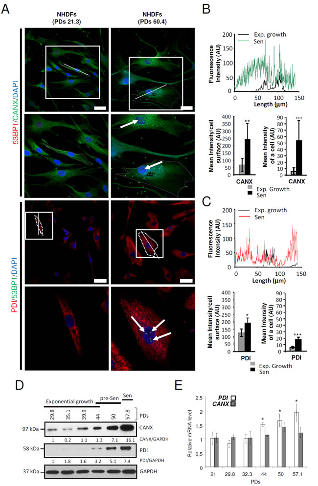 Figure 2: ER-resident proteins are overexpressed at senescence in NHDFs. A. Exponentially growing (PDs 21.3) and senescent NHDFs (PDs 60.4) were seeded onto coverslips, fixed, and processed for immunofluorescence co-detection of endogenous Calnexin (CANX) (green) and 53BP1 (red) or Protein Disulfide Isomerase (PDI) (red) and 53BP1 (green) Cell nuclei were detected by DAPI staining (blue). Each condition was tested in triplicate. Representative confocal photomicrographs of CANX immunostaining and 53BP1 foci (white arrows) or PDI immunostaining and 53BP1 foci (white arrows) are shown. Bar = 50 µm. The square delimits the below image at higher magnification. B. and C. Graphs showing the distribution of fluorescence intensity (arbitrary units) of representative exponentially growing and senescent NHDFs along the largest cellular axis (white line in A). Quantification of the fluorescence signal coupled to anti-CANX antibody (B) or coupled to anti-PDI antibody (C), as mean intensity of a cell, and mean intensity/cell surface, using Image J software. Values are means of >40 cells ± SD. This experiment is representative of 3 independent ones. D. Total protein extracts from NHDFs at the indicated population doublings were analyzed by immunoblotting with anti-CANX or anti-PDI antibodies. Expression of GAPDH was used as loading control. Bands were quantified using Image J software. The results are given as a ratio to GAPDH. E. PDI and CANX and mRNA levels were measured by qRT-PCR in NHDFs at the indicated population doublings and were normalized to EAR levels. Measures were performed in triplicate. The bar chart represents the means ± SD of the three measures.