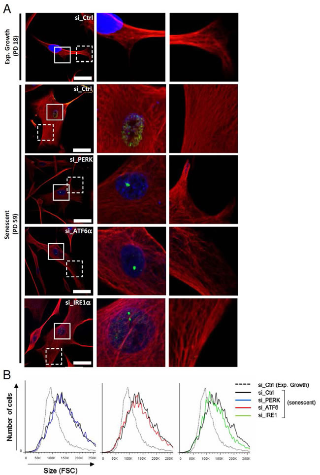 Figure 5: Cytoskeleton mediated-morphological changes of senescent NHDFs are dependent of ATF6α. A. Senescent NHDFs were subjected to PERK, ATF6α or IRE1α silencing by siRNA as well as a non-target control. Representative confocal photomicrographs of endogenous vimentin (red) inmmunostaining and 53BP1 foci (green) are shown. Cell nuclei were detected by DAPI staining (blue). Bars represent 50 µm. Middle panels, images at higher magnification to visualize 53BP1 foci. Right panels, images at higher magnification to visualize vimentin organization. B. Exponentially growing and senescent NHDFs subjected to PERK, ATF6α or IRE1α silencing by siRNA as well as a non-target control and exponentially growing NHDFs were analysed by flow cytometry. Cell distribution was plotted against cell size (forward scattering, FSC).