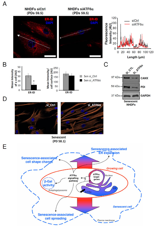 Figure 6: ER expansion and cell shape changes are partly reversed by ATF6α silencing in senescent NHDFs. A. Senescent NHDFs were subjected to ATF6α silencing by siRNA as well as a non-target control and processed for fluorescence detection of ER using ER-ID (red). Cell nuclei were detected by DAPI staining (blue). Each condition was tested in triplicate; representative images are shown. Right panel: Graphs show the distribution of fluorescence intensity (arbitrary units) of representative growing and senescent NHDFs along the largest cellular axis (white line in left panels). Bar = 50 µm. B. Quantification of the fluorescence signal coupled to ER-ID, as mean intensity of a cell, and mean intensity/cell surface, using Image J software. Values are means of >20 cells ± SD. This experiment is representative of 3 independent ones. C. Senescent NHDFs were subjected to ATF6α silencing by siRNA as well as a non-target control. Total protein extracts were analyzed by immunoblotting with anti-CANX and anti-PDI antibodies. Expression of GAPDH was used as loading controls. D. Senescent NHDFs were subjected to ATF6α silencing by siRNA as well as a non-target control. Immunofluorescence analysis was performed on endogenous vimentin (red), and cell nuclei were detected by DAPI staining (blue). Each condition was tested in triplicate; representative images are shown. Bar = 50 µm. E. Schematic representation of the role of ATF6α signalling in senescence in primary fibroblasts. Normal growing NHDFs (delimited by a red line) can enter replicative senescence (blue line). The ATF6α arm of the UPR is activated during senescence and is thought to be a key player in controlling morphological changes associated to senescence, including cell enlargement, cell shape, ER expansion, and SA-β-Gal activity.