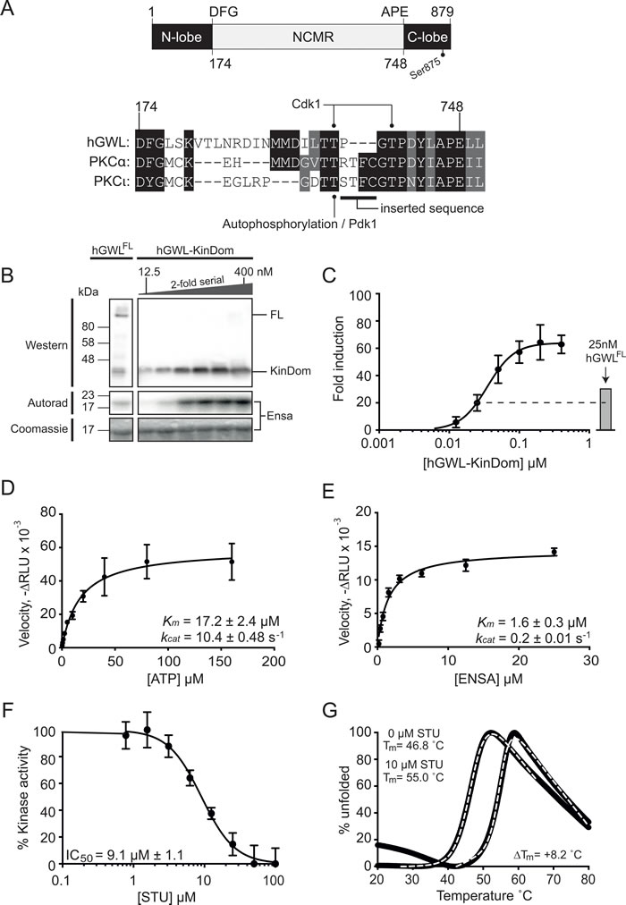 Figure 1: Biochemical and biophysical characterisation of the minimal kinase construct hGWL-KinDom. (A., top) GWL is an unusual bifurcated protein kinase, containing a large ~500 amino acid insertion (NCMR, non-conserved middle region) between the conserved DFG and APE motifs of the activation segment / T-loop. The amino acid boundaries of the N- and C-lobes of the kinase domain are indicated, as well as the C-terminal phosphorylation site (Ser875) known to be essential for function. (A., bottom) Amino acid sequence alignment of the activation segment / T-loop of human GWL with the PKC isoforms alpha (α) and iota (ι). Threonine residues within this region of GWL are known to be phosphorylated in vivo, Thr194 by Cdk1 [28] and the equivalent of Thr718 in Xenopus laevis GWL (T725) [24]. The equivalent residues in PKC-α and PCKι, Thr497 and Thr412 respectively, are instead phosphorylated by PDK1. The ‘RTFC’ sequence taken from PKCα, in order to generate hGWL-KinDom is highlighted. Absolutely conserved residues are shown with a black background, with residues conserved by property shown with a grey background. B. hGWL-KinDom was serially diluted by 2-fold and each concentration was subjected to a radioactive kinase assay. The same concentrations of hGWL-KinDom were analysed by western analysis. Immunoprecipitated Flag-tagged hGWLFL was subjected to the same analyses as assay controls. C. Kinase activity was normalised to total ENSA levels, measured as the 32P-Ensa intensity (autorad)/ENSA intensity (densitometry) ratio and plotted as fold-induction relative to background; kinase deficient control reaction. (D,E) Kinetic parameters (kcat, KM) were established by diluting either ATP or ENSA serially by 2-fold and subjecting each concentration to a Kinase-Glo Max assay. Non-linear regression using Prism 6.0 and the built-in enzyme kinetics module were used to determine Michaelis-Menten kinetic parameters, kcat and Km, for both ATP D. and ENSA E. F. hGWL-KinDom was subjected to either increasing concentrations of staurosporine (STU) or DMSO and the resulting kinase activity was determined using the Kinase-Glo Max assay. The % kinase activity was normalised to the DMSO control and non-linear regression using Prism 6.0 was used to determine IC50 values. G.Thermal shift assay. Binding of hGWL-KinDom (1.5 μM) to STU (10μM) produces a positive temperature mid-point (Tm) shift of 8.2 °C, indicating compound binding.