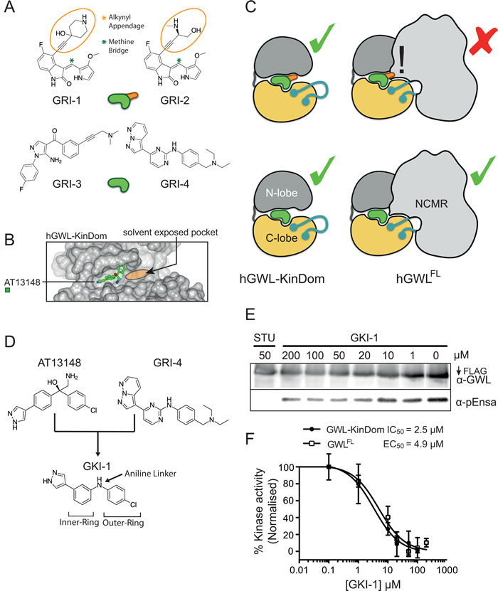 Figure 4: Model describing the minimal structural requirements for small-molecule inhibition of hGWLFL. A. Small molecule inhibitors are rendered as a green or green and orange cartoons with (orange appendage) or without the alkynyl appendage. B. GWL is rendered as a cartoon with (hGWLFL) or without (hGWL-KinDom) the NCMR region. This model illustrates how the NCMR could act as a steric filter, which prevents small-molecules with large appendages from docking within the nucleotide-binding site. C. Molecular modelling of AT13148 within the nucleotide-binding site of hGWL. Docking with hGWL-KinDom crystal structure (where the disordered C-helix was homology-modelled) reveals a large solvent-exposed pocket vicinal to the ligand-binding site. D. Rational design of a first generation hGWL inhibitor using an AT13148 scaffold and incorporating the GRI-4 aniline linker. E., F. hGWL-KinDom () or immunoprecipitated hGWLFL () were treated with increasing concentrations of GKI-1 and kinase activity was measured by either the Kinase-Glo Max (☐) or immunoprecipitation kinase assays (☐). (F) % kinase activity was normalised to the DMSO control, and the smallest and largest values defined and plotted as 0 and 100 % kinase activity respectively. Non-linear regression with Prism 6.0 was used to determine IC50 (hGWL-KinDom) or EC50 (hGWLFL) values.