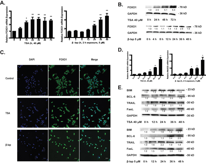 Figure 1: NQO1 substrates TSA and β-lap induce FOXO1 activation. A549 cells were treated with 40 μM of TSA or 5 μM of β-lap for 2 h and harvested at indicated time. The mRNA level A. and protein level B. of FOXO1. FOXO1 protein translocation from cytoplasm into nucleus was observed by confocal microscope C. The mRNA level of MnSOD D. The protein levels of BIM, BCL-6, TRAIL and FasL E. Data are shown as mean ± SEM of three independent experiments (*P<0.05, **P<0.01, TSA or β-lap treatment compared with control group).