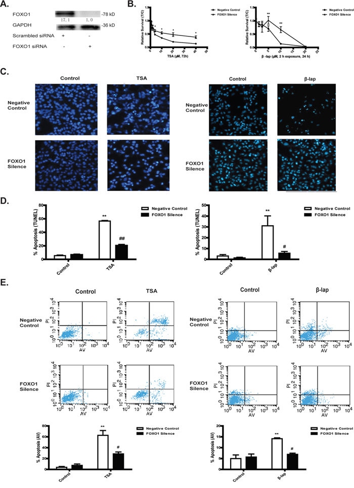 Figure 2: NQO1 substrates-initated apoptotic cell death is FOXO1-dependent. A549 cells were treated with FOXO1 siRNA or scrambled siRNA for 24 h. Cells pretreated with siRNA were then treated with TSA (40 μM, 72 h) or β-lap (5 μM, 2 h exposure, 24 h). Silencing efficacy A. Cytotoxicity test by MTT B. DNA damage assessed by Hoechst 33342 staining C. Cell apoptosis assessed by TUNEL assay D. and Annexin V-FITC/PI assay E. Data are shown as mean ± SEM of three independent experiments (**P<0.01, TSA or β-lap treatment compared with control group; #P<0.05, ## P<0.01, FOXO1 siRNA pretreatment compared with scrambled siRNA pretreatment).